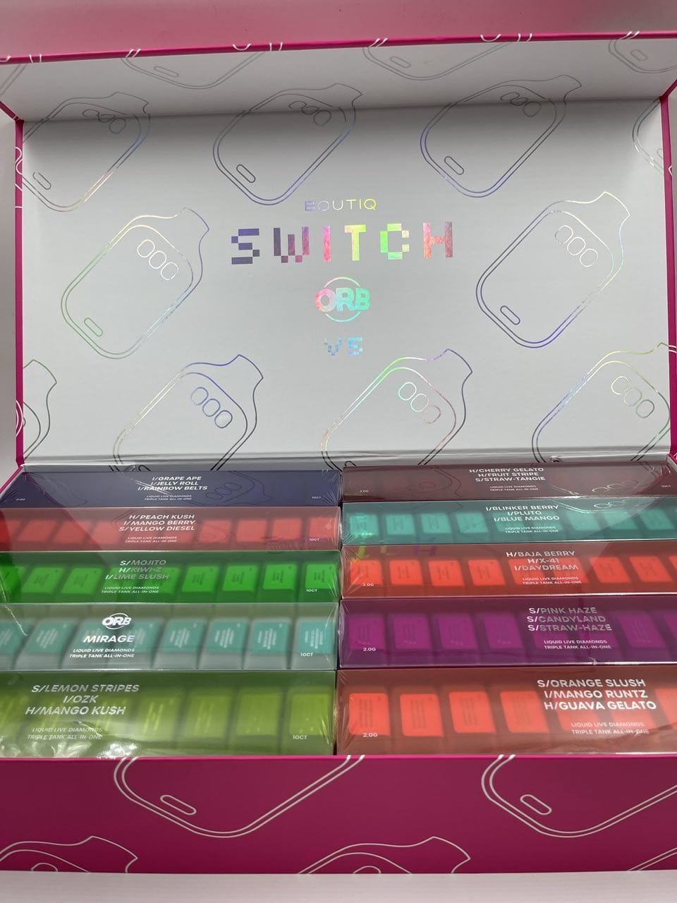 | FLAVORS | LEMON STRIPES(SATIVA)/OZK(INDICA)/MANGO KUSH(HYBRID), MOJITO(SATIVA)/KIWI Z(HYBRID)/LIME SLUSH(INDICA), PEACH KUSH(HYBRID)/MANGO BERRY(INDICA)/YELLOW DIESEL(SATIVA), GRAPE APE(INDICA)/JELLY ROLL(INDICA)/RAINBOW BELTS(INDICA), CHERRY GELATO(HYBRID)/FRUIT STRIPE(HYBRID)/STRAW-TANGIE(SATIVA), BLINKER BERRY(INDICA)/PLUTO(INDICA)/BLUE MANGO(INDICA), BAJA BERRY(HYBRID)/X-41(HYBRID)/DAY DREAM(INDICA), PINK HAZE(SATIVA)/CANDYLAND(SATIVA)/STRAW-HAZE(SATIVA), ORANGE SLUSH(SATIVA)/MANGO RUNT(INDICA)/GUAVA GELATO(HYBRID)10PK (MIXED FLAVORS), 25PK (MIXED FLAVORS), 50PK (MIXED FLAVORS), 100PK (MIXED FLAVORS) |