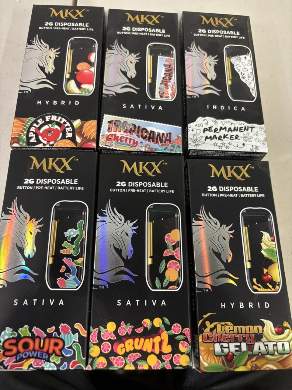 • Look for product names like “MKX Permanent Marker Disposable,” “MKX Strawberry Cough Disposable,” and other strain‑labeled pens.